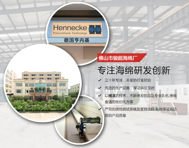 ●三十年专注,厂房面积近10万平方米,骏超海绵主要产品有各高低密度海绵,高回弹海绵,记忆海绵,阻燃海绵等。